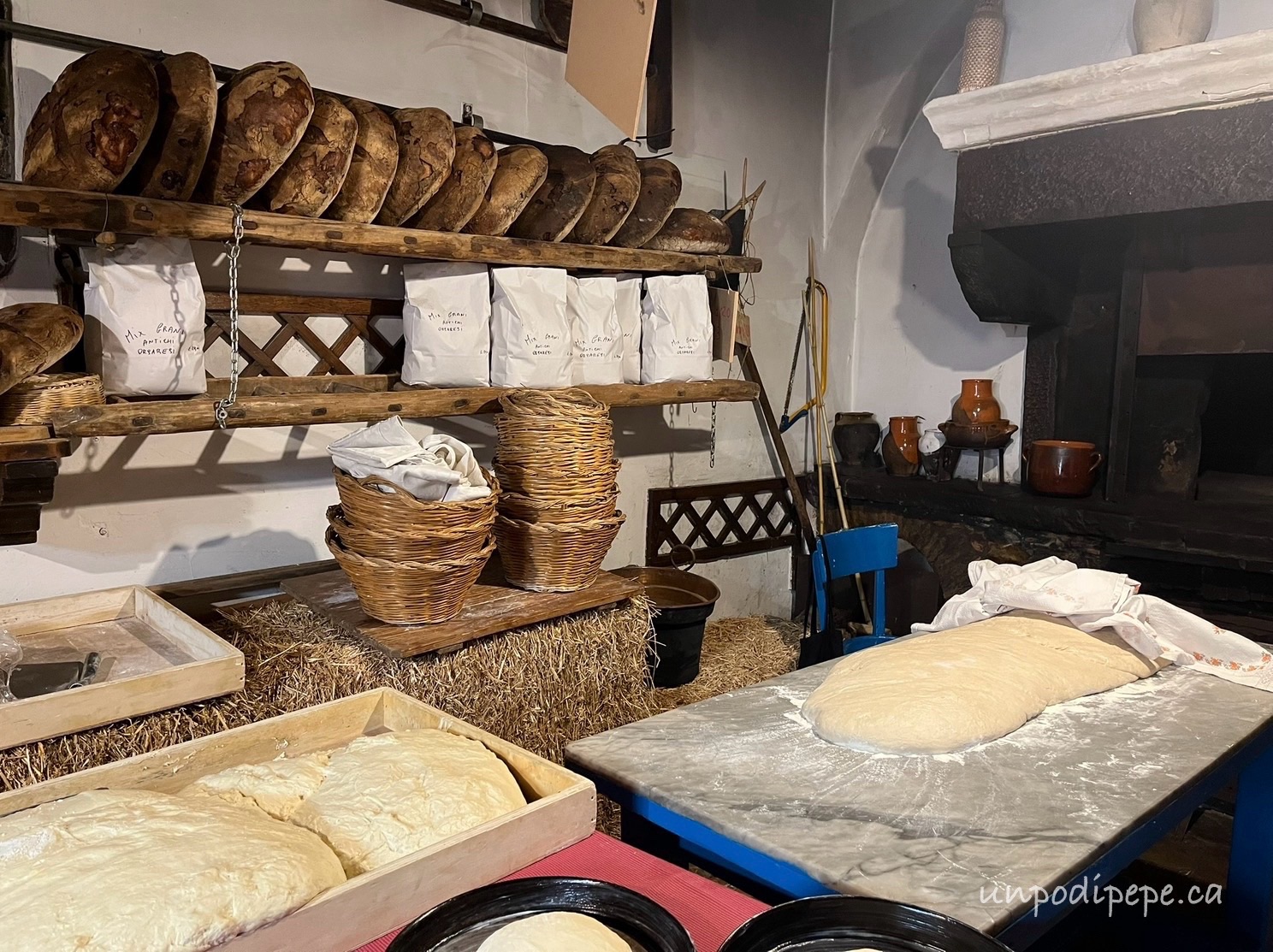 The dough is formed into in 3-4 kg rounds, given the sign of the cross, and left to rise in cloth covered straw baskets. Straw goes into the bottom door of the forno and heat comes up the central hole, called ‘la bocca del inferno’.