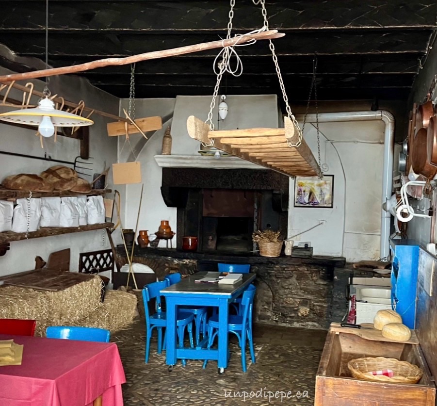 Pane e Salute is also a pizzeria and restaurant, serving traditional Orsarese dishes, such as pancotto e patate. The restaurant consists of the forno plus 2 other rooms, and has a cozy, rustic look. In the winter, salsicce hang from the ceiling to dry in the room with the forno. In the summer, there are tables under an archway and in the narrow street with fairy lights. Fun fact…..in the 1970’s, my nonni lived above this archway! Pizza is made with the same bread dough, but is cooked in a pizza oven in the kitchen, not in the 1526 forno. My favourite is the salsiccia e fichi (sausage and fresh figs) pizza.