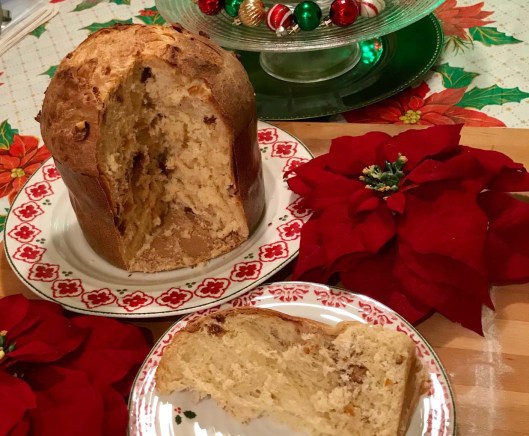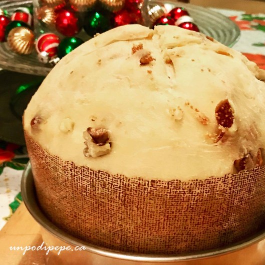 I started experimenting with panettone last year. I did not do it intentionally… it was an act of desperation. I had made lievito madre– mother yeast or bread starter that I was keeping for months, and needed to feed at least once or twice a week. I had to do something with the part you need to give away or throw out. It was invading my cucina! I ran out of people to give it to, and did not like throwing it away. Then I found out I could use my lievito madre to make panettone. Yeast still had to be added, but the lievito madre added flavour and texture to the dough and helped it stay fresh longer. I adapted this overnight panettone recipe, replacing 1 cup of flour with 1 cup of my starter. It was pretty good. This year, I no longer have my starter, plus I lost all of my recipe experimentation notes. Mannaggia! So I had to start all over, but luckily my panettone turned out better. This time I used a biga (BEE•gah), a sort of ‘mini starter’ that ferments overnight. After trying a lot of different things, I can finally post the recipe, just in time for Natale. Traditionally, panettone is made with uvetta and canditi-raisins and candied citrus peel. I love panettone, and canditi, but I usually end up picking out the raisins, so I used dried figs soaked in grappa instead. If you like raisins, they do grappa well too! Panettone dough needs to rise 3 times, so this recipe is not recommended for the inpatient or inexperienced bread baker. Be sure to read my notes at the bottom. My previous post Panettone details the history of this lovely dolce.
