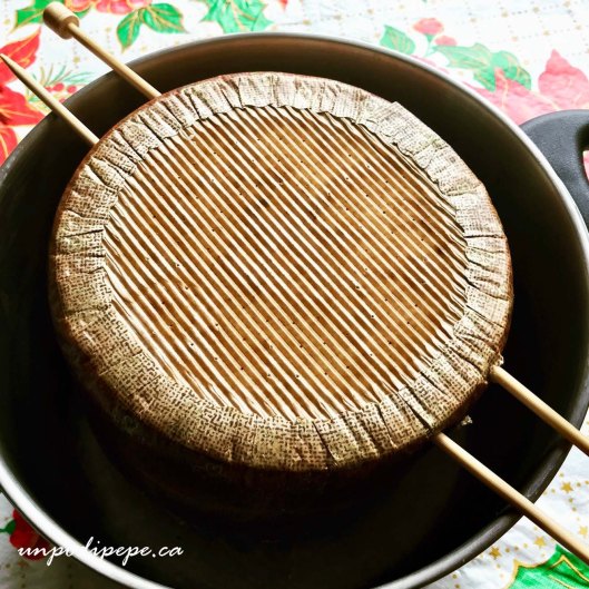 Cool panettone upside down to prevent falling. I could not find bamboo skewers, so I used my bamboo knitting needles to skewer the bottom then hung it upside down over a large pot. I don’t know if this step is really necessary, but after all this work, I am not willing to find out! It also looks cool. See photo: