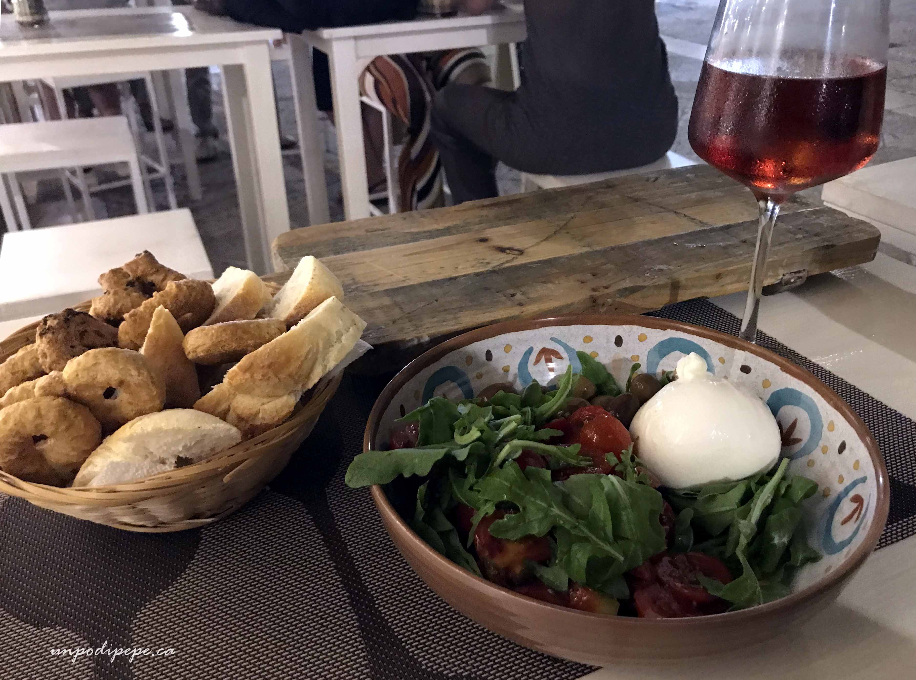 Sit outside to have Caffè Leccese –espresso on ice with almond milk and of course local vino, especially my favourite-Negroamaro. Here is my cena with Negroamaro rosé.