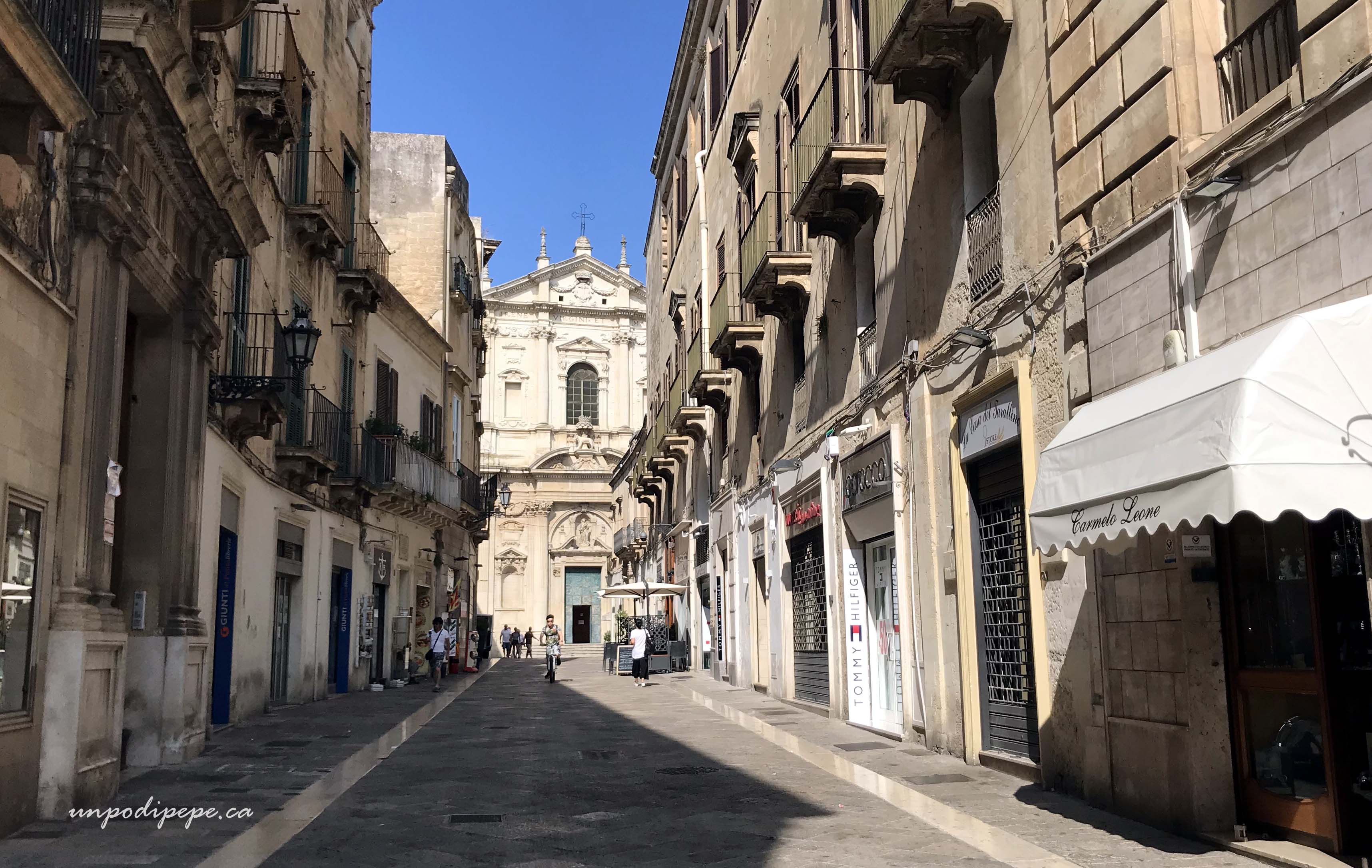 Lecce is a great place to shop. Specialties include colourful Pugliese ceramics, carta pesta, olive oil and vino. Lecce observes the pausa pranzo which means shops are closed from 2-5pm.