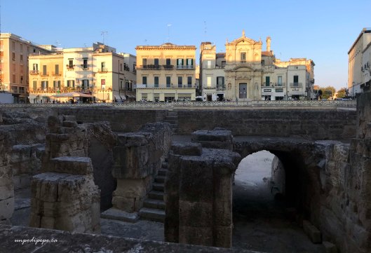 Piazza Sant’Oronzo, named for the first Christian bishop and the patron saint of Lecce, was the site of the mercato. The 2nd Century AD Roman anfiteatro was discovered in 1901 during construction of a new Banca d’Italia.