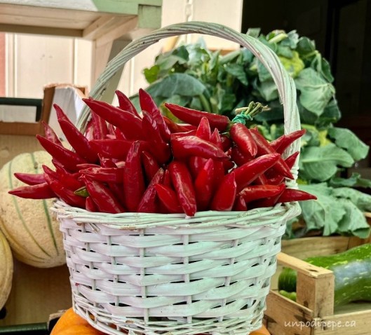 What did I bring back from Calabria?  Peperoncini, also known as ‘Viagra Calabrese‘, Bergamotto-the citrus fruit used to flavour Earl Grey tea, and the famous cipolla rossa di Tropea -Tropea red onions.  This is where I bought my goodies.  Behind the Lanzellotti bancarella is a pepper tree-growing pepe rosso-red peppercorns!  Un po’di pepe!