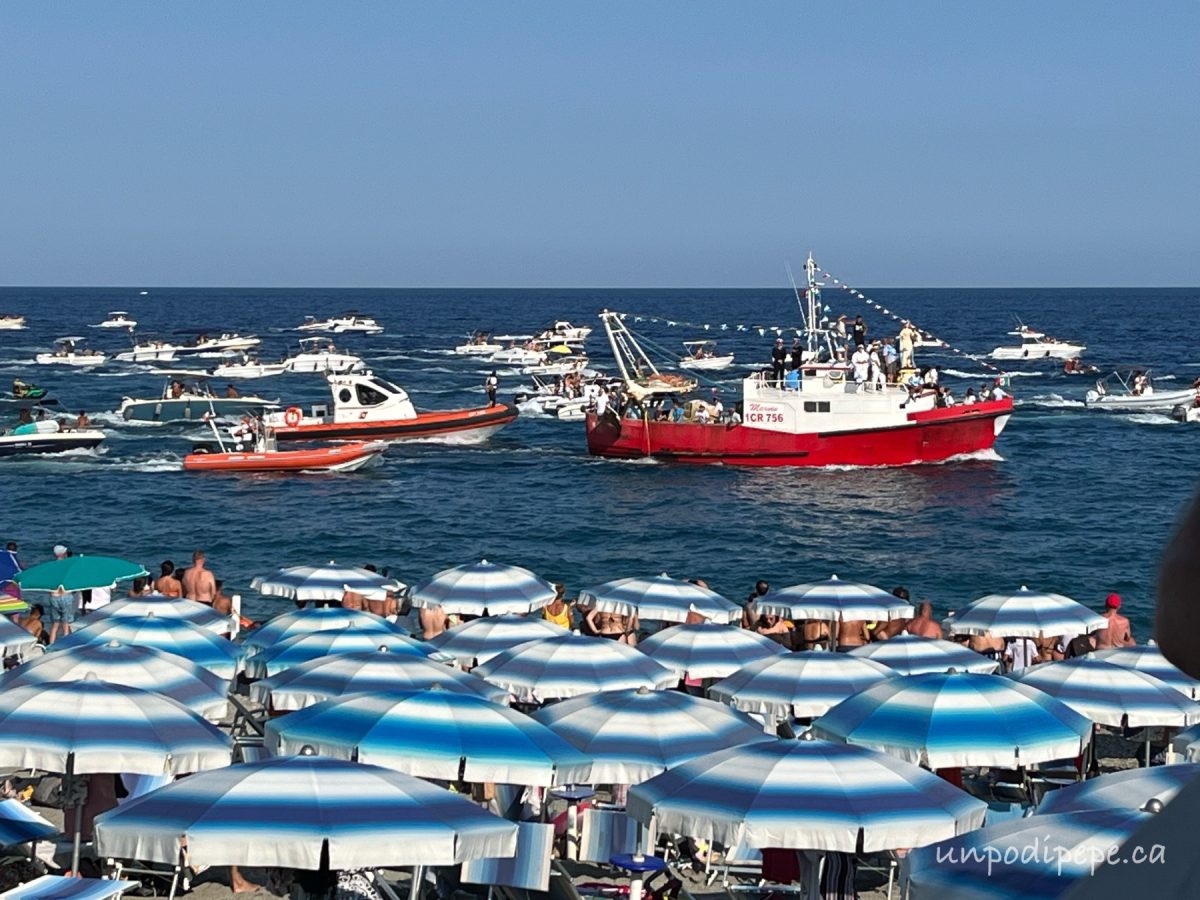 Calabria, the ‘toe’ and ‘foot’ of the Italian boot, is one of the lesser travelled areas of the country, and also one of the least expensive to visit.  I was there during the last week of July and it was not crowded where I was.  Calabria is known for rocky coastlines, crystal clear water, beautiful beaches, ancient mountain villages, castles and archeological sites.  I saw all of the above.I only went to a small area of Calabria on the Ionian Sea (east coast) around the Golfo di Squillace, in the province of Catanzaro. This is the narrowest part of Calabria, so it is possible to drive to the west coast, to Tropea, in an hour and a half.  My friends are in Squillace Lido, and as soon as I arrived, we went to Catanzaro Lido for the Festa della Madonna di Porto Salvo.  The highlight of the festa was a sea procession.  The Madonna was in the large red-hulled boat and all the other boats followed.