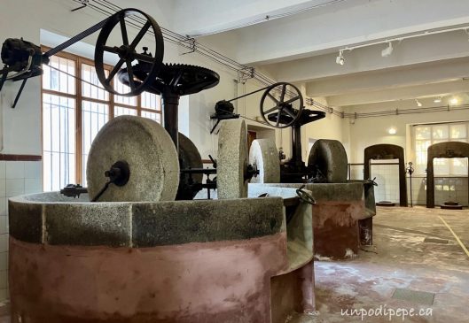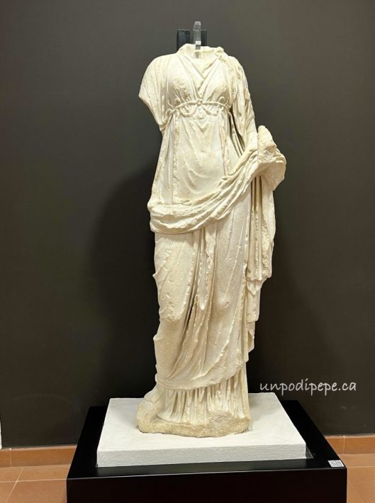 Squillace (skwee•LAH•cheh) population ~3500, was originally the Greek colony of Scylletium and then the Roman town of Scolacium.  I visited the Parco Archeologico Scolacium, which was formerly a large olive farm and orchard by the sea.  The site has Roman, Byzantine and Norman ruins.  It was discovered in the 1800’s by farmers, but not excavated until 1965. The residence of the former owner, Baron Mazza, is now the museum and you can also walk through the old olive mill.  The statues in the museum are covered in scrapes made by farm implements!  Ouch! Please read my friend Karen in Calabria’s post about Scolacium, she took better photos than mine.