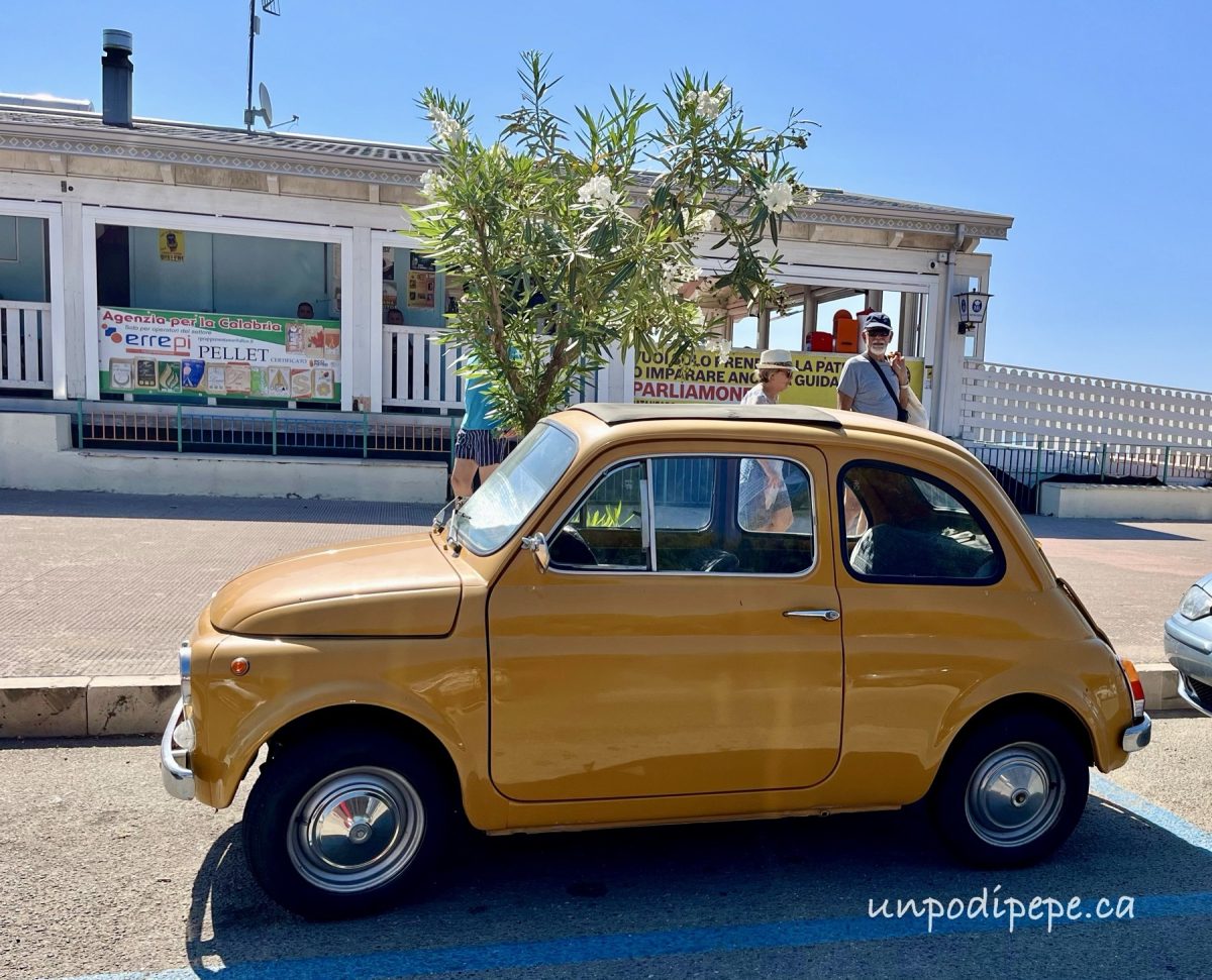 Every morning, we went to the beach -to Squillace Lido, and everyone I met-both on the beach, under an ombrellone, or in the water-was a cousin of Rosetta or her husband Enrico!  Some of these cugini lived in the area and some had moved to other parts of Italia, returning for the summer.  What an amazing thing!  It was so hot, I stayed in the water most of the time.  The sand was coarse, and my feet had a nice daily exfoliation.Even on the beach in Calabria, my Cinquecento radar was on high alert!