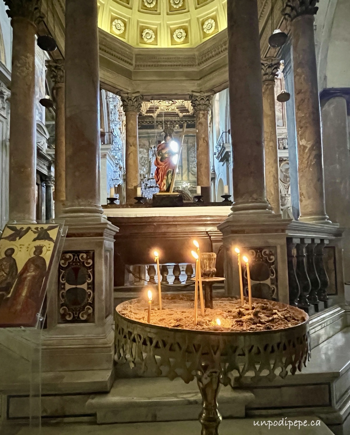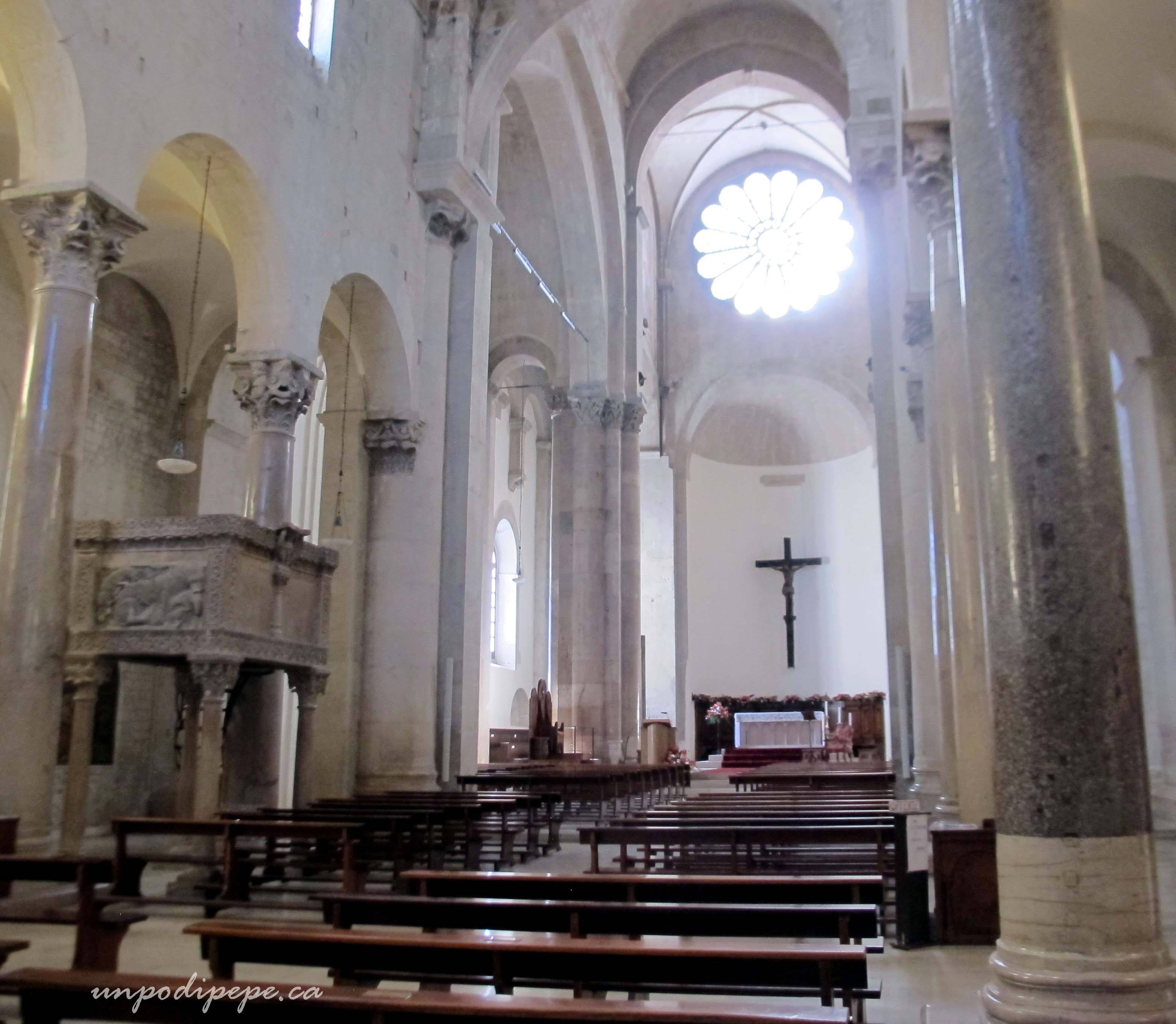 In contrast to the ornate exterior, the interior of the cattedrale is simple.  The design is a Latin cross plan with 3 aisles separated by 13 Corinthian columns, 2 rows of 6 and a 3rd row in the SW corner with only one column, as seen in the photo below.  These represent the 12 apostles and Christ. There is no ceiling, the beamed wood roof is exposed. The Cathedrals in the Romanico Pugliese style, including Troia’s, are on the tentative list for UNESCO World Heritage Sites.  This is the step before becoming a heritage site!Interior of the Cathedral of Troia, with a view of the 13th column
