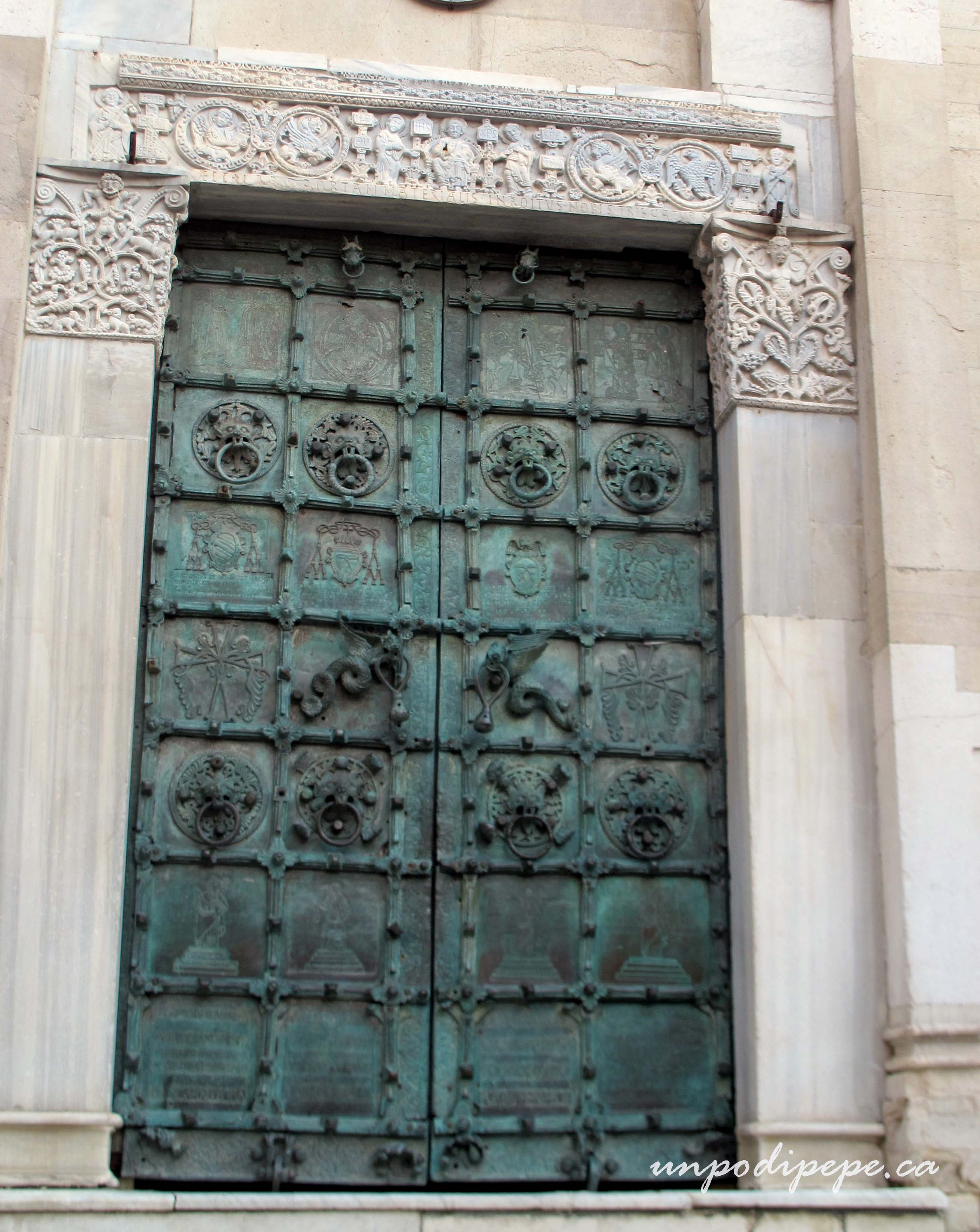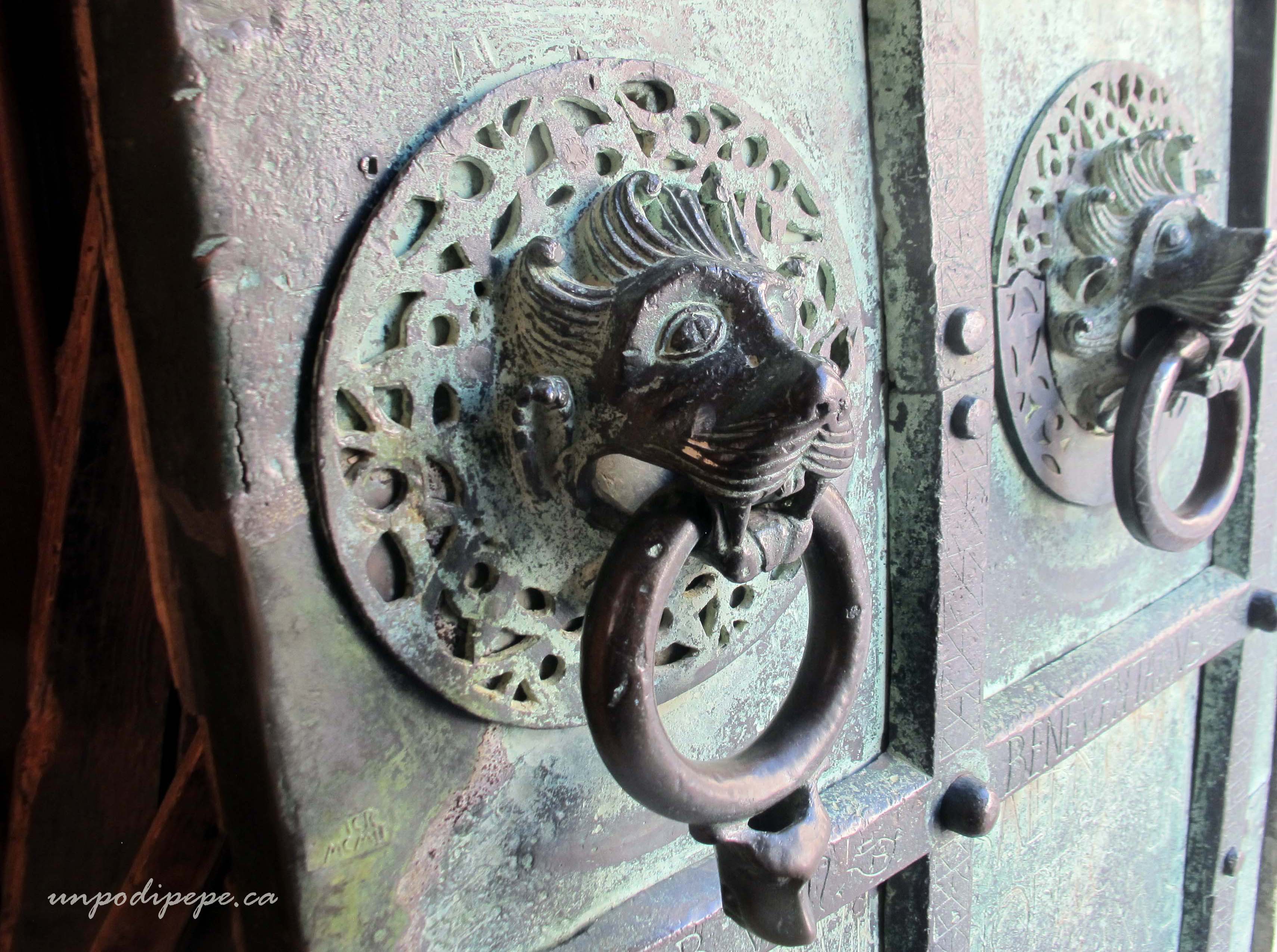 The lower front is a 7 arch façade-the center one being the main entrance through bronze doors with the most magnificent dragon handles. They look straight out of Trono di Spada (Game of Thrones)! The doors were built in 1127 by Oderisio da Benevento. Troia cathedral dragon door handles and lion knockers The doors are decorated with reliefs and inscriptions.  There are 10 knockers; 8 lions and 2 wyverns, which are small 2 legged dragons.  On each side of the door are 3 blind arches topped with geometric carvings and a round window on the middle arch.  The arches on the side of the building are topped with geometric sun and moon patterns in green stone. The main doors are closed and entry is only through the side door, another bronze by Oderisio da Benevento.  The church is usually open during the day, and of course during Masses.Troia Cathedral bronze door lion door knockers