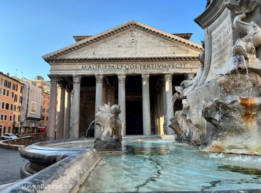 The Fontana di Trevi is one of the most iconic structures in Roma-a Baroque masterpiece with a direct link to the Ancient Roman Empire.  Every year, millions of tourists visit, trying to capture a perfect photo, tossing in a coin to ensure a return visit to Roma.  Sometimes it can feel like a mosh pit! The water comes from an ancient aqueduct, Aqua Virgo (Acqua Vergine in Italiano), 9 m below ground, built in 19 BC.  It still functions today and provides water to the fountains in Central Roma.  Find out more in the previous post Acqua Vergine.