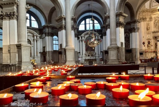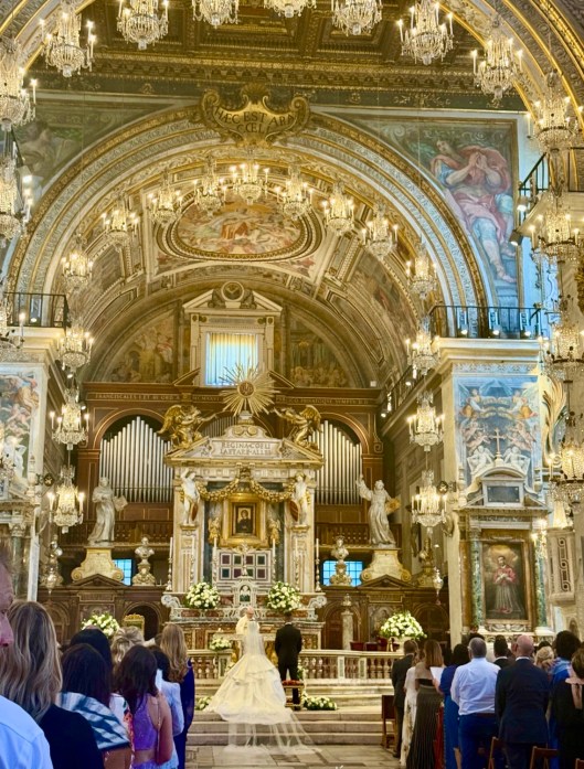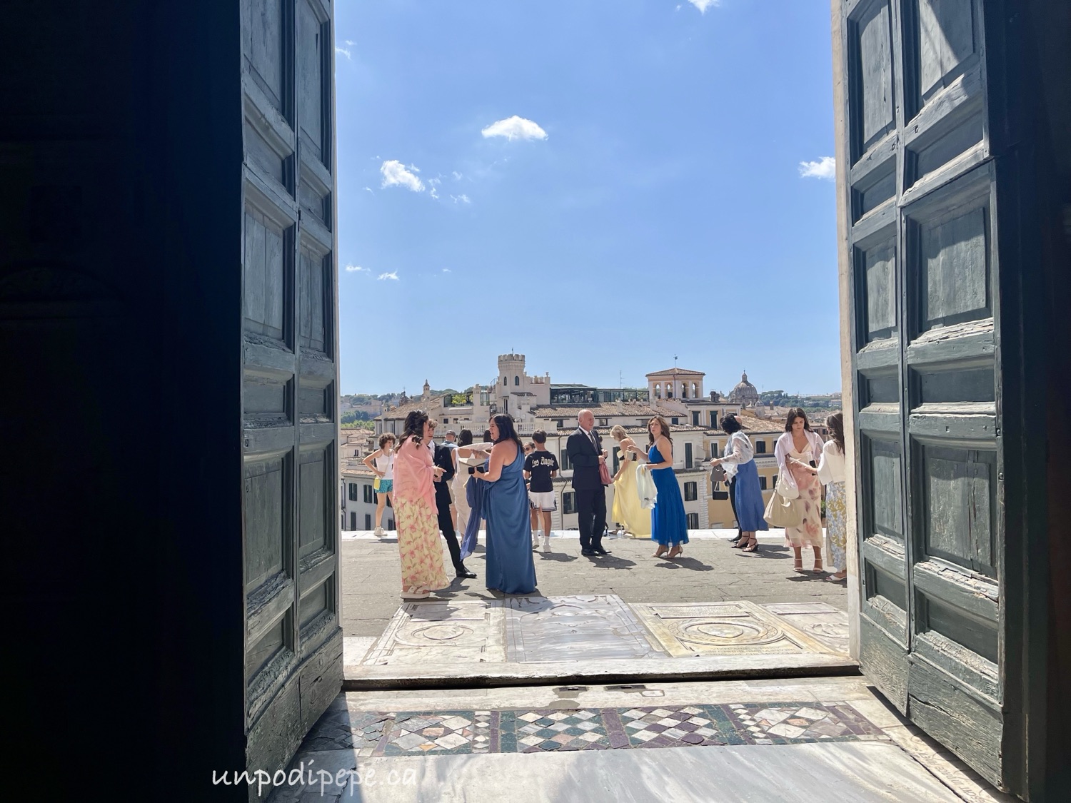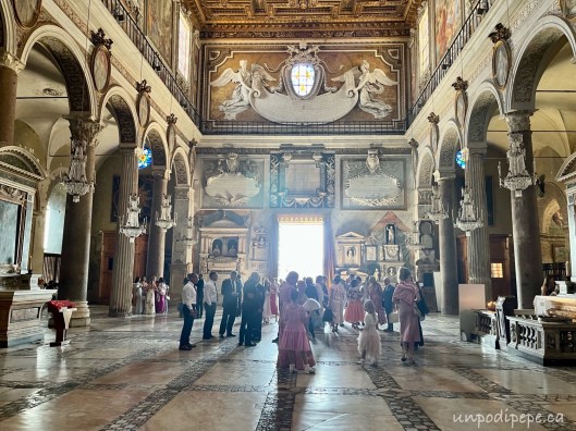 La Scala Santa, the staircase of 124 marble steps leading to the main entrance of the church, was designed in 1348 on the occasion of the end of the Black Death. The stairs are considered sacred, and people have been known to climb up on their knees, hoping for a miracle.  Luckily, none of the wedding guests chose to do this, but there were many wobbly stilettos climbing the stairs, and one extremely dirty wedding train!  Viva gli sposi!