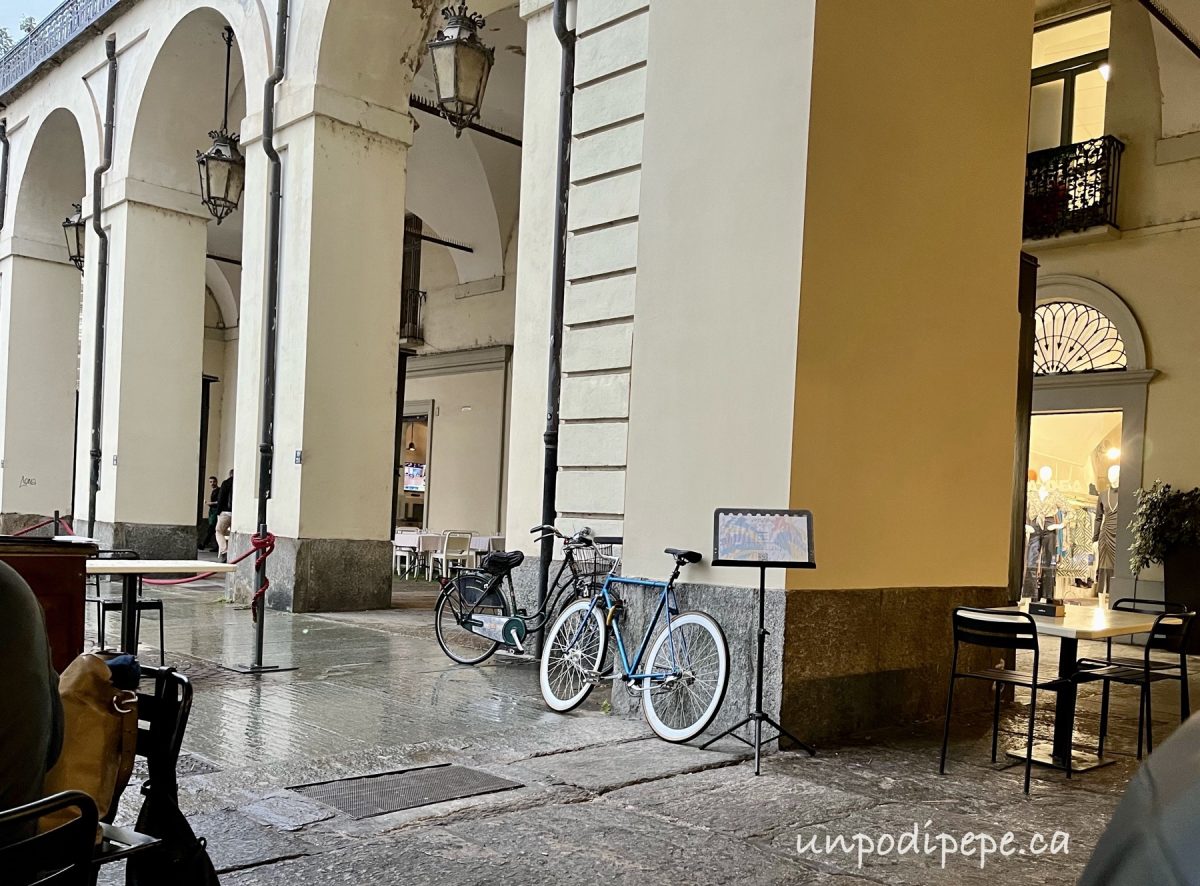 Torino’s centro, the largest pedestrian area in Europe, is easy to navigate. A defining characteristic of Torino’s architecture are the portici (porticoes). 18 km (7 miles) of portici provide shade in summer and shelter from rain, snow and wind.  12.4 km are continuous.  According to legend, King Vittorio Emanuele I wanted Torino to be elegant and also wanted to go on his daily walk to the river Po without getting wet.  So he had the portici built -and now everyone can window shop in all weather conditions.  A whole day can be devoted to walking the portici. Torinesi use them a lot!