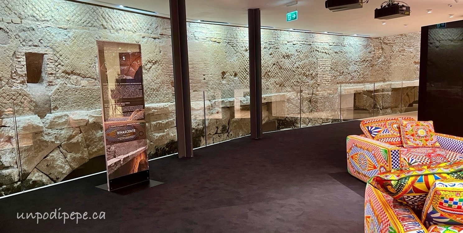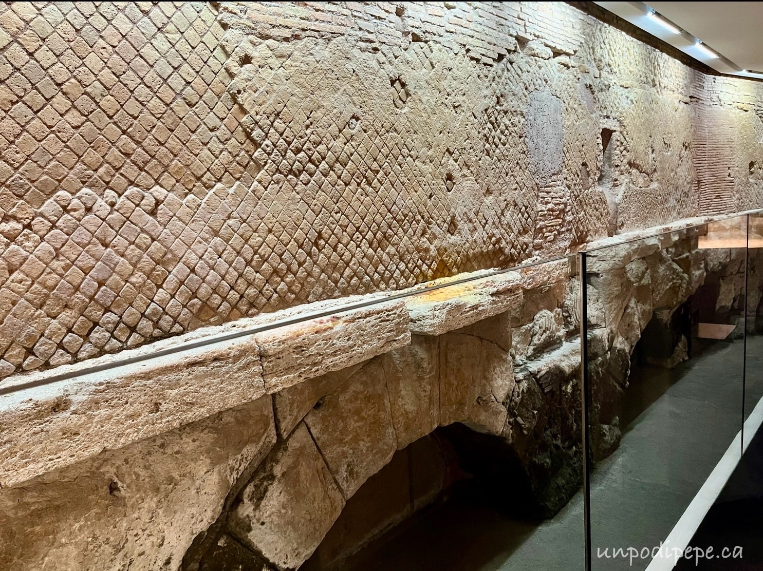 Acqua Vergine Antica runs under Villa Borghese and Villa Medici to Piazza di Spagna and Fontana di Trevi. In 1930 renovated Aqua Vergine Nuova goes behind Piazza di Spagna to Piazza through Giardini Borghese to Piazza Flaminio and Piazza del Popolo. Most of the aqueduct’s 21 km are 9m underground, except for the last stretch running partly on arches as it approached the Campo Marzio area, emerging from the hill by the present La Rinascente Department store. There is also an arch standing on Via del Nazareno, north of Trevi.  Part of Aqua Virgo was found during construction of the new La Rinascente department store location, delaying the opening by 2 years. In 2017 the new Flagship La Rinascente store on Via Tritone 61 opened, including a basement archeological site with a 60 m (197 ft) section of Aqua Virgo on display. Admission is free.  When I went, there was a Dolce and Gabbana furniture exhibit! Just take the escalator down to the bottom floor any time the store is open. Where else but Roma can you combine high end shopping and archeology?