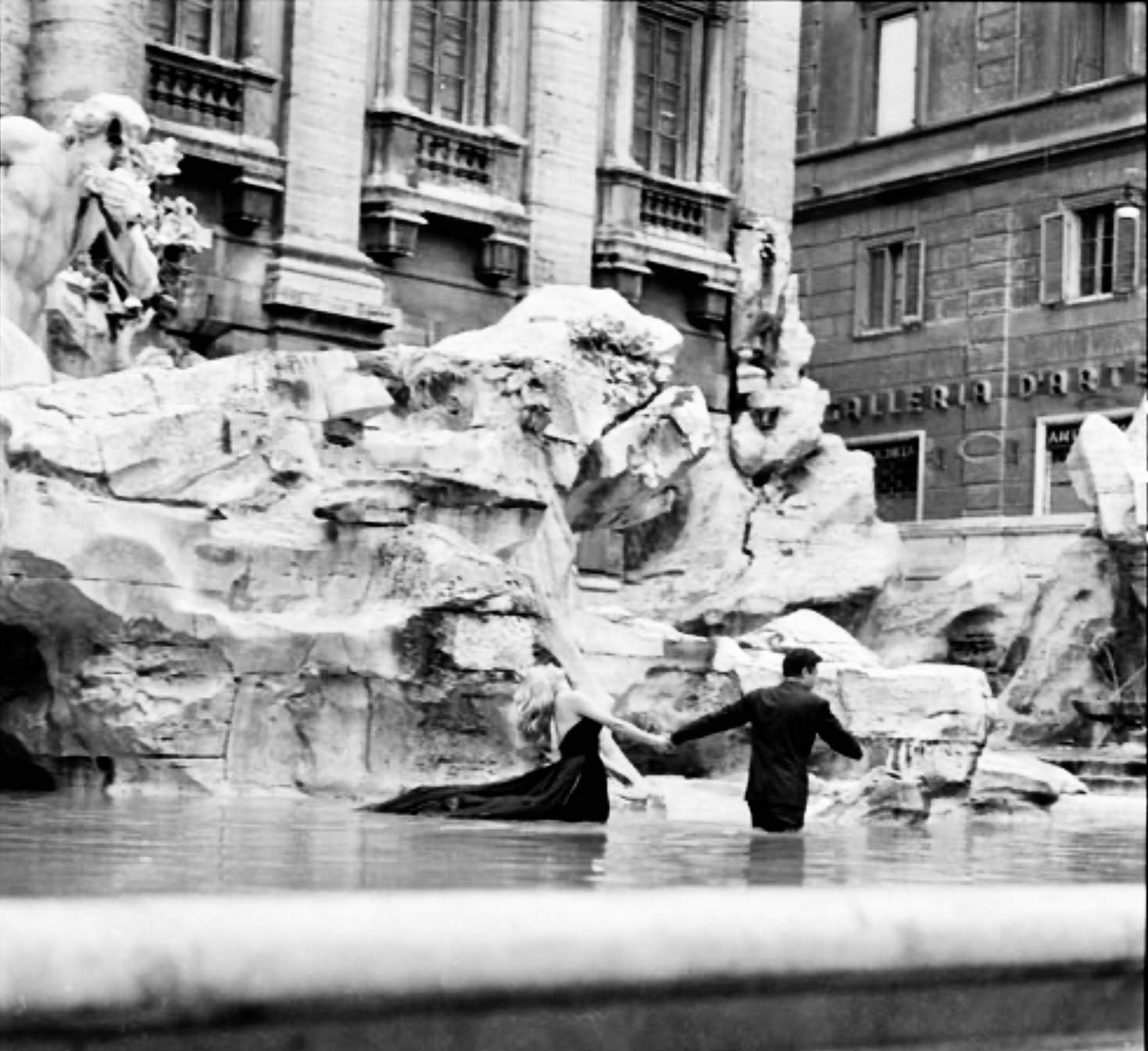The Fontana was immortalized in film in 1960 when Anita Ekberg walked in with her clothes on in the Fellini classic La Dolce Vita.  Do not be like Anita-you will be immediately slapped with a €450 fine. When her costar Marcello Mastroianni died in 1996, the Fontana di Trevi was draped in black, the water and lights turned off in his honour. Below is part of a poster-note how dirty the stone was in 1960!  The spouts of Fontanella degli Innamorati can be seen on the far right.