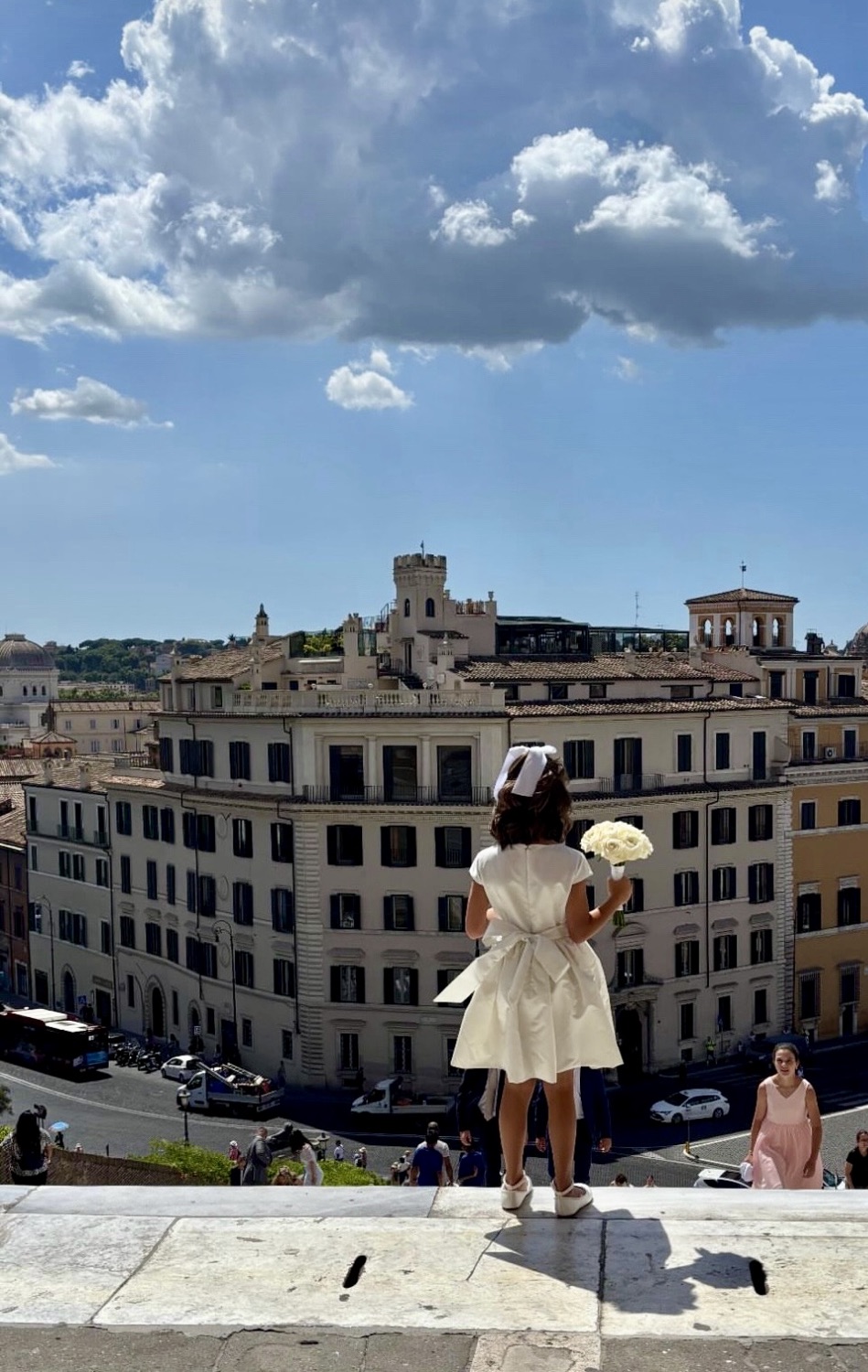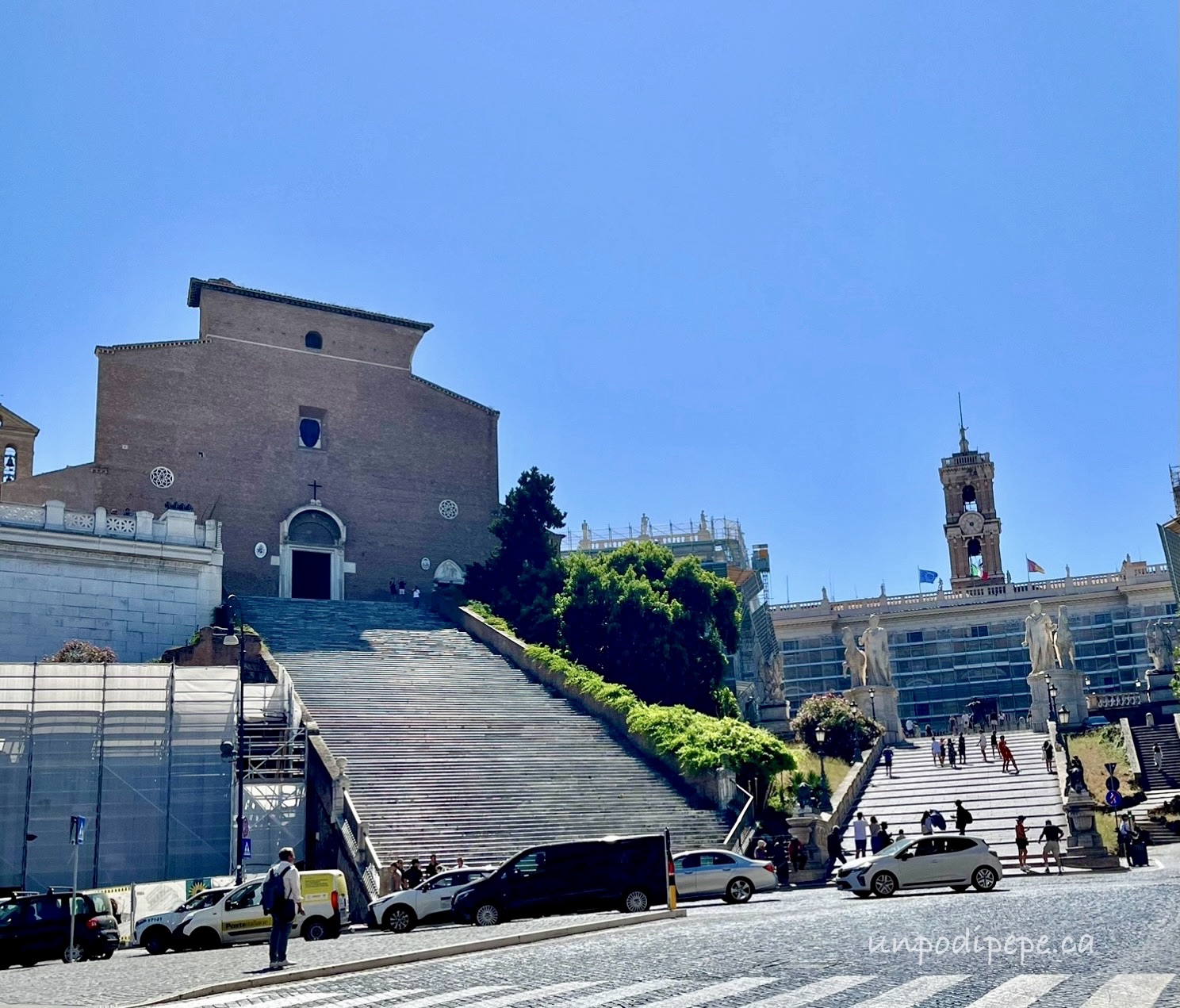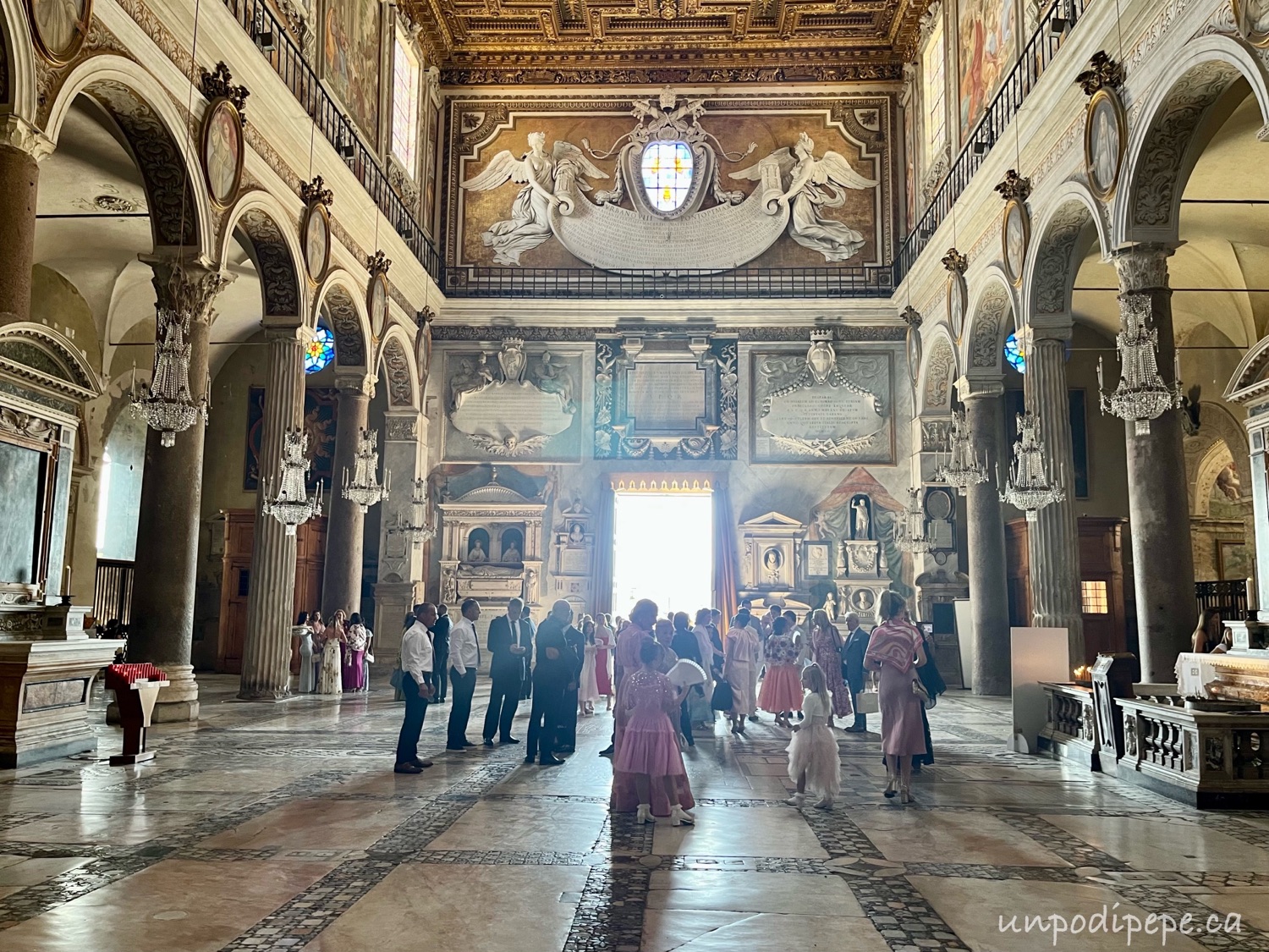I recently attended a family wedding in one of the most beautiful churches in Roma, the Basilica Santa Maria in Aracoeli (pronounced Ah*rah*CHEH*lee). Because of its location on the highest point of the Capitoline Hill, sandwiched between Il Vittoriano and the staircase to Il Campidoglio, most visitors have seen it from the outside-but they have no idea what treasures the interior holds. Photos in this post are from the July rehearsal and wedding of Isabella and John.Translated from Latin, Santa Maria in Aracoeli means ‘Santa Maria of the altar in Heaven’. The Romanesque Gothic Basilica was built on the site of a Temple to Giunone (Juno) in the year 574.  Originally a Greek Byzantine church, it was taken over by the Benedictines in the 9th Century, then later the Franciscans in 1249.  Santa Maria in Aracoeli is one of the principal churches of Roma and the designated church of the city council and the Senate and people of Roma (SPQR). The Municipio, or City Hall of Roma is conveniently located behind the Basilica, on the Campidoglio.  During the French occupation of 1797, the Basilica was turned into a stable for the French cavalry!  It was almost demolished in the 1880’s during construction of its massive neighbour Il Vittoriano /L’Altare della Patria. In the photo above, the white monument is Il Vittoriano, the building behind it with the steep staircase is Santa Maria in Aracoeli and the staircase on the right leads to Piazza del Campidoglio, where the Capitoline Museum and Municipio are located.The interior is elaborately decorated, with a coffered and gilded wooden ceiling (1575).  The exquisite cream and pink marble floor is decorated with Cosmati, an inlay geometric style of Medieval stonework. The arches are supported on 22 columns scavenged and upcycled from diverse ancient ruins throughout the city. This is why no 2 of the columns are alike.  52 gorgeous Murano glass chandeliers hang in the nave and sanctuary. They were all lit during the wedding.