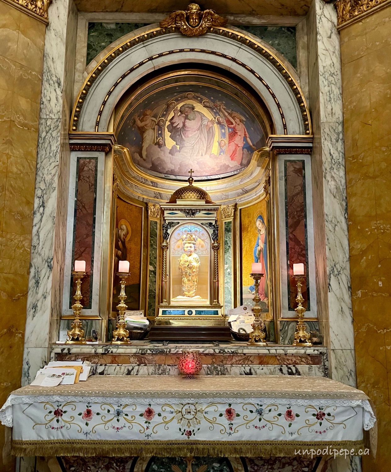 On the altar, is a 10th Century Byzantine icon painted on beech wood, la Madonna di Aracoeli. She is holding up her hand, which is painted in gold.  La Madonna di Aracoeli was carried through the streets of Roma during the Black Plague outbreak in 1348, and is credited with the shorter duration of the epidemic. To the left of the altar an octagonal tempietto or shrine contains the Byzantine relics of Sant’ Elena (St. Helena), the mother of Emperor Constantine. Cappella Bufalini, the first chapel on the right of the entrance, contains a series of 15th Century frescoes by Pinturicchio.  There are also frescoes by Pietro Cavallini and Arnolfo di Cambio, and countless other works of art.The most famous item in the church is the Santissimo Bambinello, a 15th Century bejewelled wooden sculpture of baby Jesus carved out of olive wood from the gardens of Gethsemane in Jerusalem, and baptised in the river Jordan.  It is believed to have healing powers. Unfortunately, he was stolen in 1994, and is still missing.  Today, the Bambinello in a private chapel by the small gift shop is a replica.