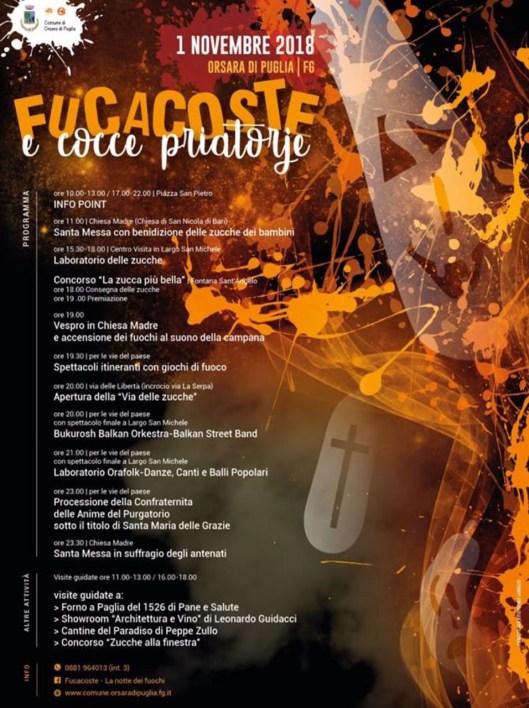 November 1st is Tutti i Santi-All Saints’ Day and is a national holiday in Italia. It was created in the 9th century when the Pope superimposed a Christian feast day onto existing rituals, so this festa has been around for a very long time. Tonight is also an ancient festa celebrated in Orsara di Puglia called Fucacoste e Cocce Priatorje which is dialetto Orsarese for ‘Falò e teste del Purgatorio’. This translates to ‘Bonfires and heads from purgatory’ the ‘heads’ being zucche lanterne-carved pumpkin lanterns. For simplicity, it is also called ‘Tutti i Santi’ or ‘La Festa dei Morti’.