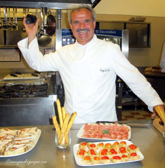 Wine is an integral part of growing up in an italocanadese family and is a staple of every family function. Everyone was allowed to have a bit of vino with dinner – it was exciting and made us feel grown up. Even when we were little … at first with 7-Up, Sprite or Ginger Ale, and eventually straight vino. In the summer, everyone looks forward to la pesca in vino. This involves cutting up a fresh peach, placing the slices in a glass, then filling it with vino. After the wine is consumed, lovely, sweet, wine-saturated peach slices await you for dessert. The peach slices take up most of the space in the glass, so the amount of wine to drink is really very little.