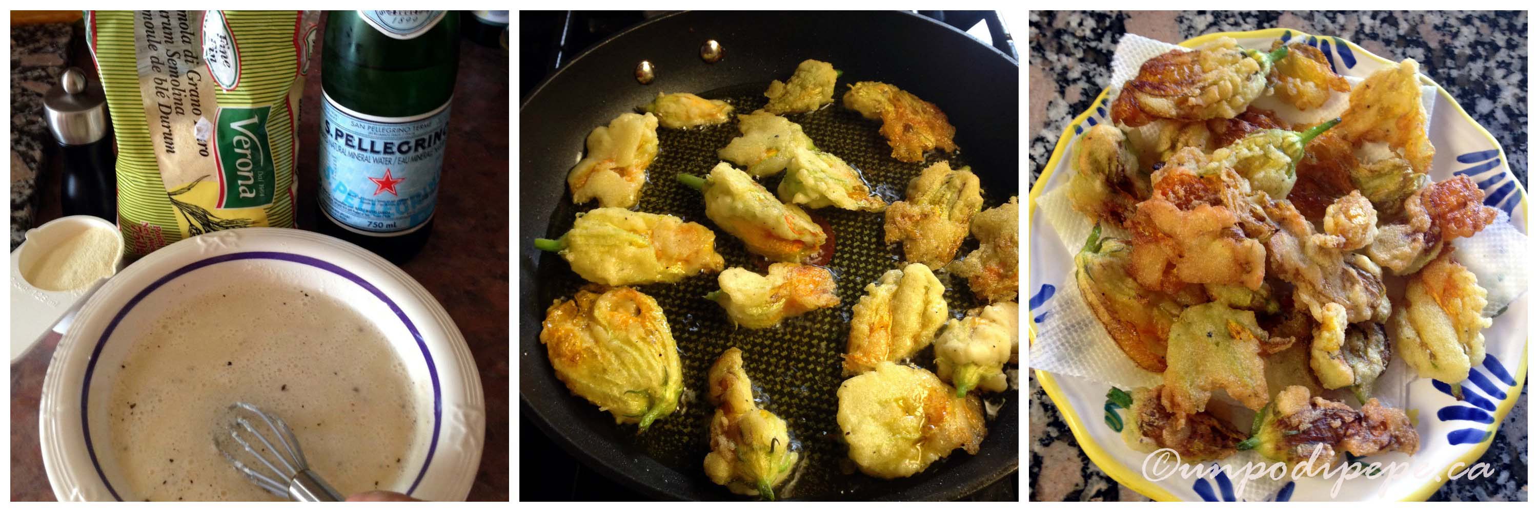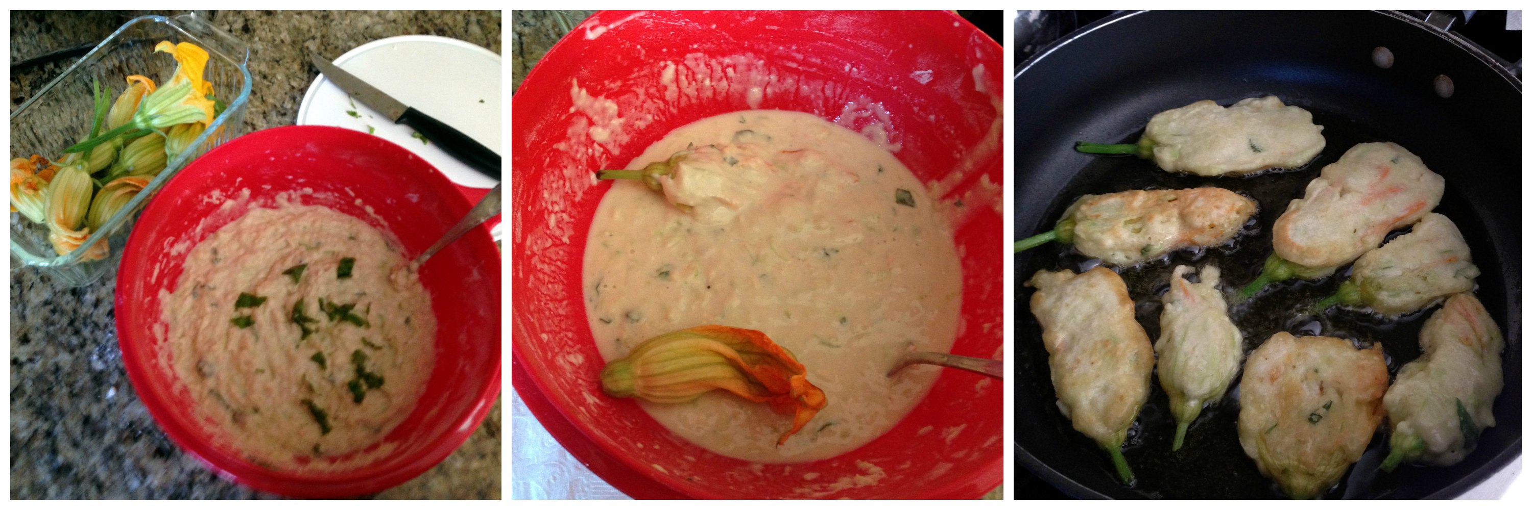 Fiori di zucca are one of my favourite summer foods-and my favourite bouquet of flowers. My Zio brought over a LOT of them one day, an hour before we were going to be eating. I stuffed some of them with what I had available. There were a few trecce-fresh, braided mozzarella, in the fridge and basilico growing out on the tiny terrazza. Once they were stuffed, I battered them in flour and mineral water with a few bonus ingredients like parmigiano and basilico, and then fried them.