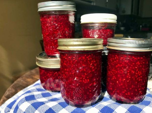 Freezer space is at a premium right now, so the frozen raspberries from my garden had to be used to make jam. In a few months there will be new berries to pick.