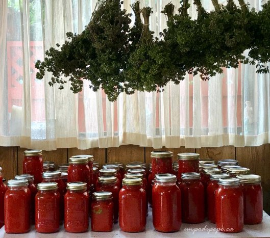 Speaking of pomodori, a few weeks ago, my parents’ cantina had only 3 litres of pasta left on the shelf! That has never happened before. Luckily, my family got together for our 2 day ‘salsapalooza’ and made 273 litres of passata di pomodoro. The cantina is restocked, as you can see! The whole process can be found in the post Passata di Pomodoro.