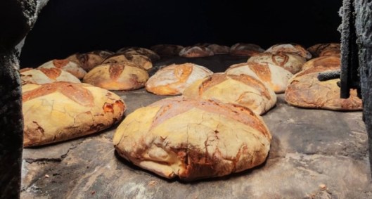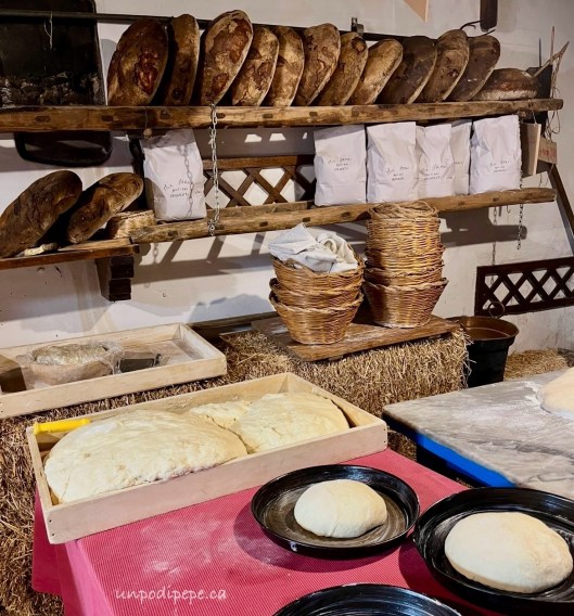 When the forno is hot enough, the loaves are baked for 2- 2 ½ hours and then placed on the horizontal ladders to cool. The bread comes out crusty, with a soft inside and has a long shelf life of 15 days. The straw burning oven gives it a unique taste. The bread sells for €5 per kilo and it is best to pre-order.