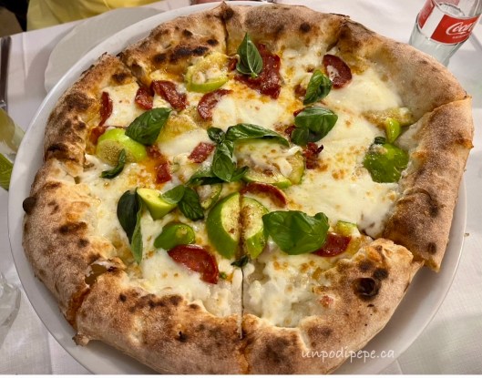 Pane e Salute is also a pizzeria and restaurant, serving traditional Orsarese dishes, such as pancotto e patate. The restaurant consists of the forno plus 2 other rooms, and has a cozy, rustic look. In the winter, salsicce hang from the ceiling to dry in the room with the forno. In the summer, there are tables under an archway and in the narrow street with fairy lights. Fun fact…..in the 1970’s, my nonni lived above this archway! Pizza is made with the same bread dough, but is cooked in a pizza oven in the kitchen, not in the 1526 forno. My favourite is the salsiccia e fichi (sausage and fresh figs) pizza.